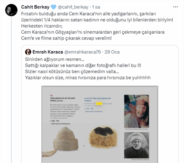 Berkay ayrıca herkesi filme sahip çıkmaya çağırdı, “Fırsatını bulduğu anda Cem Karaca’nın aile yadigarlarını, şarkıları üzerindeki 1/4 haklarını satan kadının ne olduğunu iyi bilenlerden biriyim!