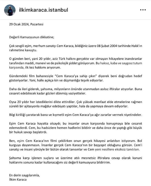 “Çok sevgili eşim Cem Karaca, bildiğiniz üzere 8 Şubat 2004 tarihinde hayatını kaybetti. O günden beri aziz Türk halkını gerçekte var olmayan hikayelere inandıranlar tarafından maddi, manevi ve de psikolojik şiddet görüyorum. Bu haksız, kaba ve saygısız tutum karşısında, ilk kez hakkımı arıyorum.