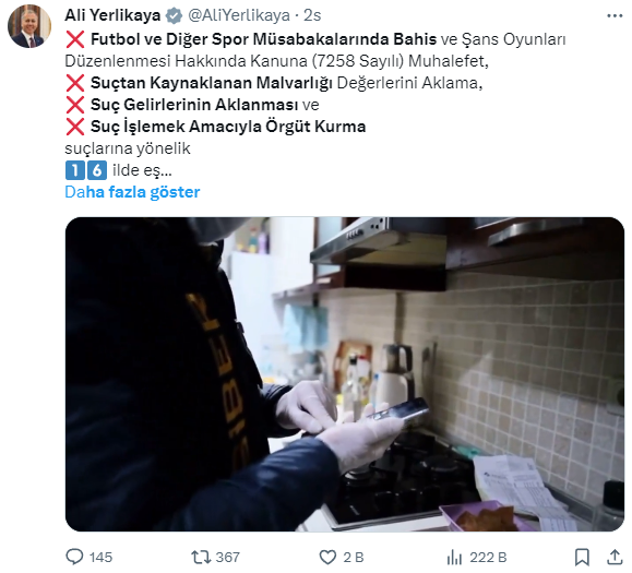Yerlikaya ayrıca ‘yasa dışı bahis’, ‘suç gelirini aklama’, ‘suç işlemek amacıyla örgüt kurma’ suçlarına yönelik Antalya merkezli 16 ilde ‘Sibergöz-14’ kod adlı operasyonlar yapıldığını belirtti.